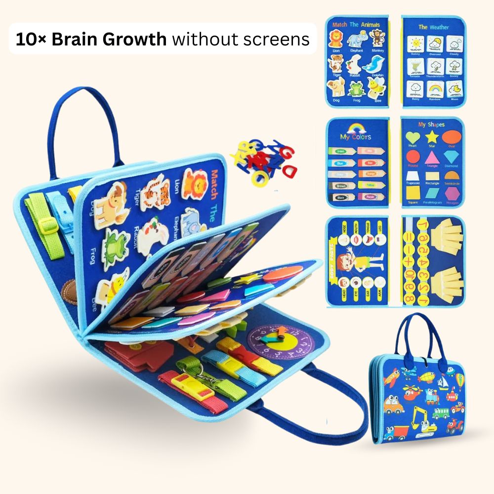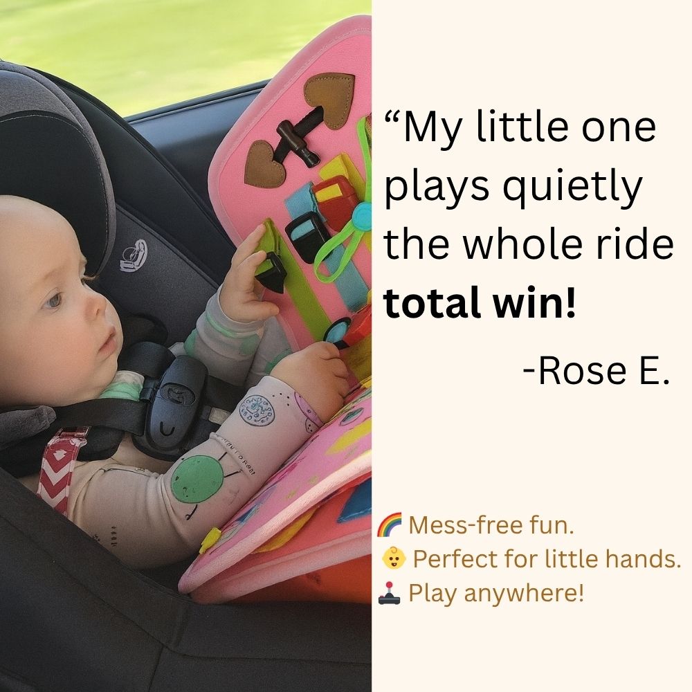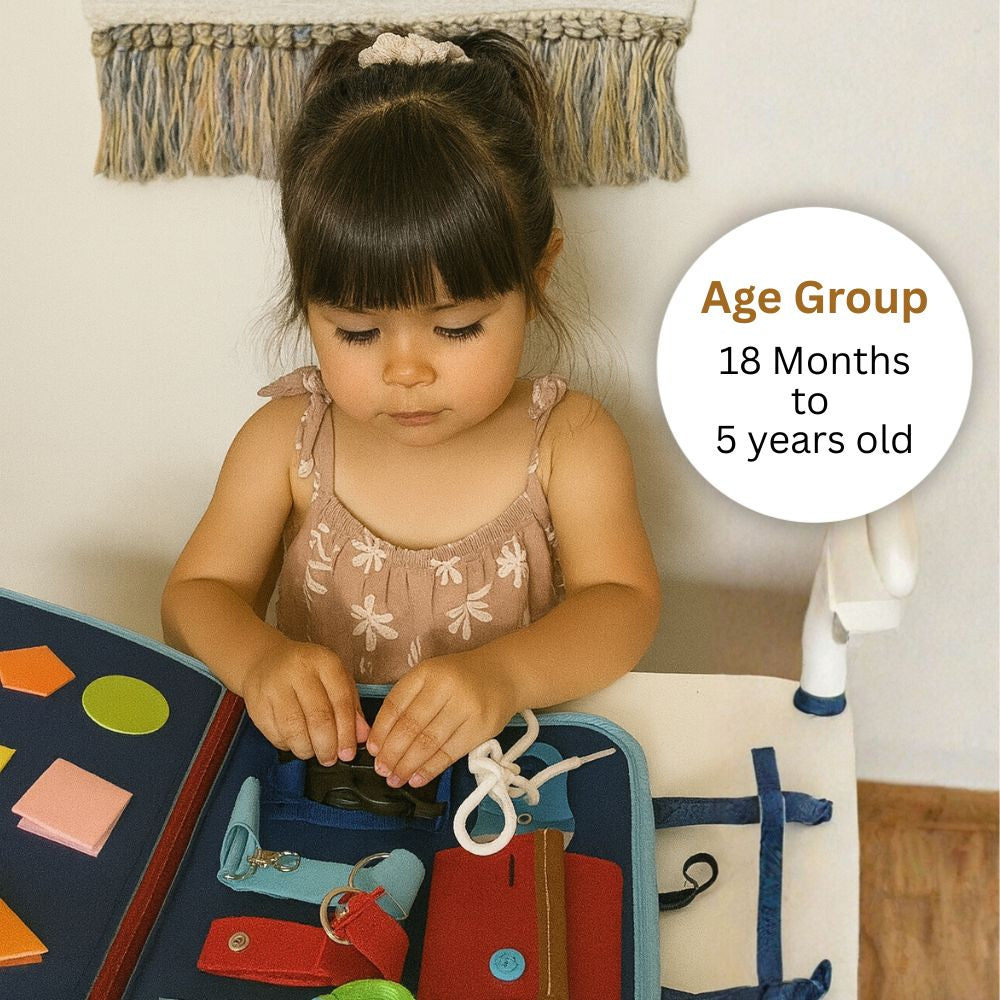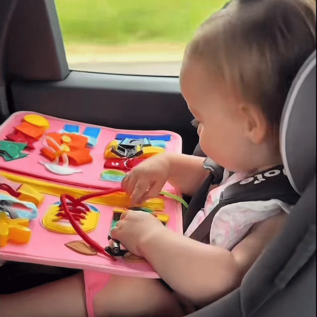 The busy board measures 28 × 25 cm (≈11 × 9.8 inches) and weighs just 0.77 lbs (0.35 kg). It’s lightweight, slim, and designed to fit easily into most diaper bags or school bags — making it the perfect travel companion for road trips, flights, or everyday outings.