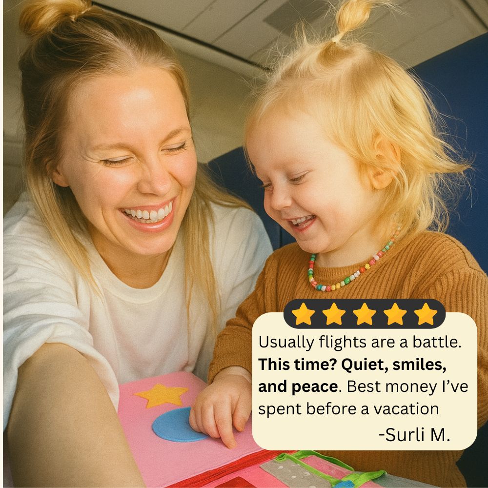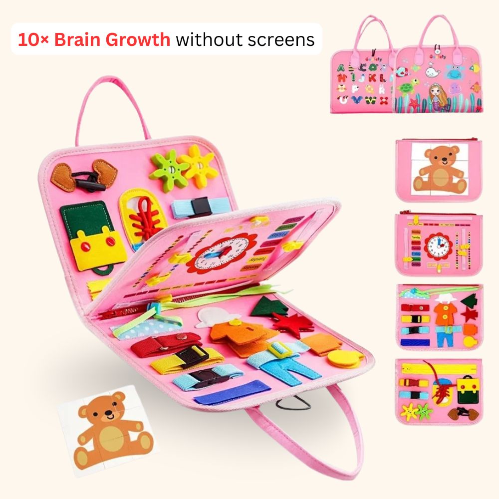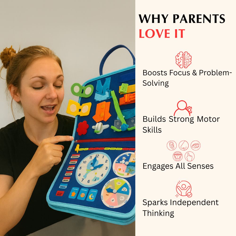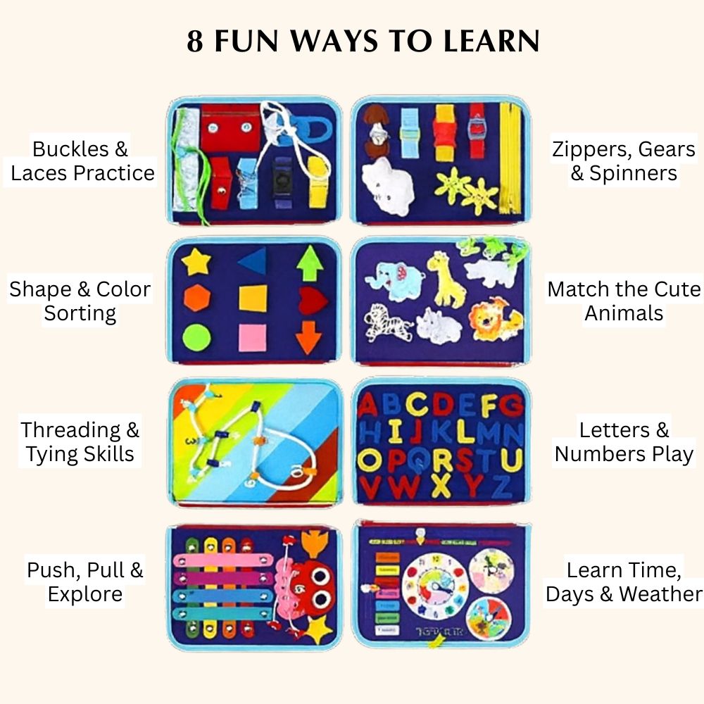 The busy board measures 28 × 25 cm (≈11 × 9.8 inches) and weighs just 0.77 lbs (0.35 kg). It’s lightweight, slim, and designed to fit easily into most diaper bags or school bags — making it the perfect travel companion for road trips, flights, or everyday outings.